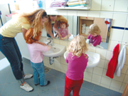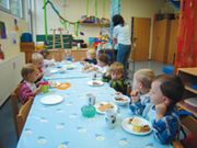 Gegen 11:30 Uhr ist das in unserer Küche zubereitete Mittagessen fertig. Hierfür gehen alle Kinder in ihren Gruppenraum und setzen sich auf ihren festen Platz. Wer kann, darf schon mit den Tisch decken. Dann fassen sich alle an den Händen, singen noch ein kleines "Essenslied" und das Essen kann beginnen. Den Jüngeren wird noch liebevoll unter die Arme gegriffen und die Älteren legen meist schon viel Wert darauf selbständig essen zu können. Da die Erzieherinnen mit essen, sind sie Vorbild und helfende Hand zugleich. Dies fördert das Interesse an den verschiedenen Lebensmitteln und bringt so manches Kind auf einen neuen Geschmack.